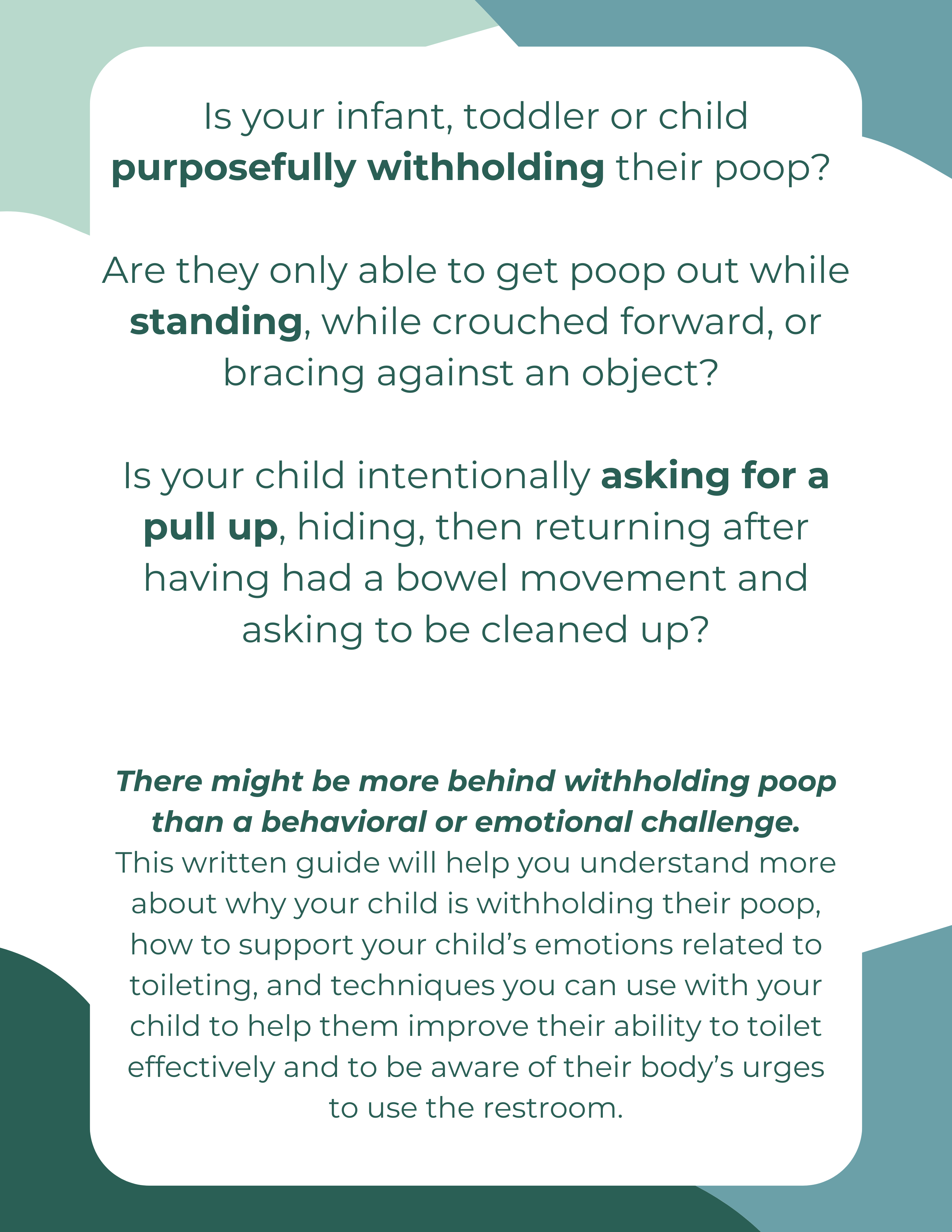 “Practicing the mechanics, skills, and exercises to help a child improve the ability to push poop out is the priority; the outcome of those practices or toilet attempts - especially in the beginning of these techniques - are not important until the physical skills are met.”